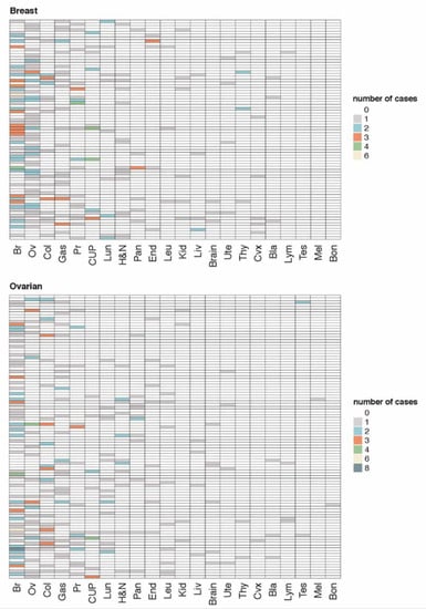 Figure 5. Personal and family cancer history of the different studied index cases. Index cases are clustered according to their personal cancer history, such as "breast" or "ovarian" when they developed ovarian or breast cancer, respectively. Each row represents the family pedigree of the index cases and the columns represent the different types of tumours in the family where each colour indicates the number of cases for a specific type of cancer. Col, colon; Gas, gastric; Pr, prostatic; CUP, cancer of unknown primary origin; Lun, lung; H&N, head and neck; Pan, pancreatic; End, endometrial; Leu, leukaemia; Kid, kidney; Liv, liver; Brain, brain; Ute, uterus; Thy, thyroid; Cvx, cervix; Bla, bladder; Lym, lymphoma; Tes, testicular; Mel, melanoma; and Bon, bone cancer.