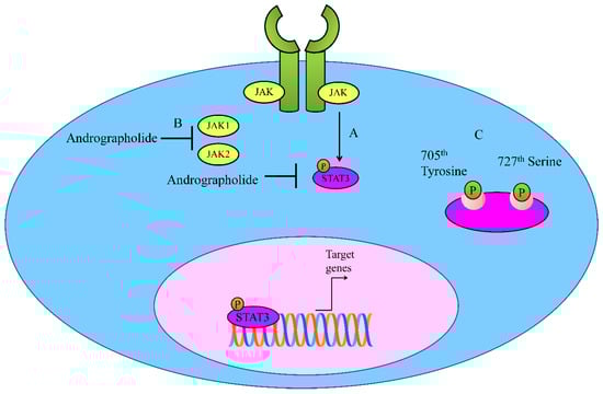 The tightly orchestrated and spatio-temporally controlled JAK/STAT (Janus Kinase/Signal Transducer and Activator of Transcription) has been shown to play instrumental role in different cellular processes (Figure 2). The deregulation of the JAK-STAT pathway was noted to be involved in cancer development. STAT proteins are phosphorylated and consequently move into the nucleus to transcriptionally upregulate target genes [,,]. SOCS (suppressor of cytokine signaling) and PIAS (protein inhibitors of activated STATs) are negative regulators of STAT-driven signaling []. However, the ability of andrographolide to regulate PIAS and SOCS in different cancers is still unclear. The regulation of STAT proteins by andrographolide has been investigated in different diseases. Here, we review the ability of andrographolide to modulate STAT proteins in cancers.