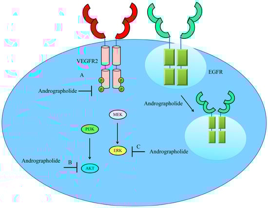 Schematic diagram of regulation of VEGF/VEGFR-driven pathway by andrographolide. Andrographolide effectively inhibited phosphorylation of VEGFR, AKT and ERK. Andrographolide also promoted internalization of EGFR to inhibit cell surface expression of EGFR and reduce EGF/EGFR-driven downstream signaling.