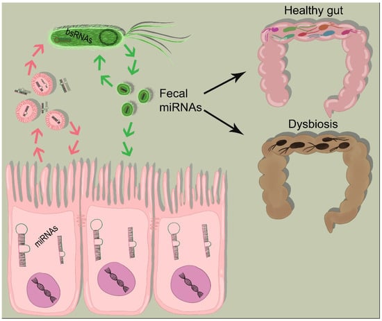 Communication molecules are necessary for “cohabitation” of bacterial and eukaryotic cells in the human body. These molecules are synthesized, released and internalized by both cell types in order to alter physiological cell function []. Communication occurs through small non-coding RNAs (sncRNAs), regulator molecules that can modulate gene expression. The sncRNAs include rRNAs, microRNAs (miRNA), tRNAs, small nucleolar RNAs (snoRNAs), small interfering RNAs (siRNAs) as well as piwi-associated RNAs (piRNAs) []. Bacterial and eukaryotic cells produce sncRNAs that are released by extracellular vehicles (EVs), a heterogeneous population of nano-sized cell-derived membranous vesicles originated from eukaryotic endosomal system (exosomes), plasma membrane (microvesicles: MVs), apoptotic bodies and/or from prokaryotic outer membrane vesicles (OMVs) or membrane vesicles (MVs) in Gram-negative and Gram-positive bacteria, respectively [,,,,,]. Biologically active components of EVs (termed “cargo”) are proteins, lipids, DNA, metabolites and extremely various RNA species (e.g., mRNAs, miRNAs, tRNAs) [,,,]. It is known that bacteria express a wide array of sncRNAs, approximately 50–400 nt in length, known as microRNA-size small RNAs (msRNAs) or generally bacterial-derived small RNA (bsRNAs) that are principally involved in the regulation of several physiological processes inside the bacterial cell [,]. Although poorly described so far, bsRNAs could regulate the expression of their respective target human genes []. In contrast, eukaryotic miRNAs are the most studied classes of sncRNA, regulating gene expression at the post-transcriptional level by binding to complementary sequences in 3′-untranslated regions (3′-UTRs) of target messenger RNAs (mRNA) [,,]. It has been estimated that more than 60% of human protein-coding genes harbor predicted targets of miRNAs [], and more than 30% of human genes have conserved miRNA binding sites in their 3′UTR []. Since such binding is not entirely homologous, miRNAs can act upon mRNA targets with limited complementarity; subsequently, a single miRNA can target a wide range of mRNAs as, in retrospect, multiple miRNAs can have similar mRNA targets as well [,,,,]. Additionally, more than 90% of human Kyoto Encyclopedia of Genes and Genomes (KEGG) pathways contain genes that are targeted by at least one miRNA [,]. The partial or full complementarity of a miRNA with the mRNA target regulates the expression of target genes generally in a negative manner causing their degradation or translational inhibition [,]. Therefore, an upregulation of a specific miRNA generally leads to a lower expression of the protein encoded by its mRNA target, whereas the downregulation of a specific miRNA could lead to higher protein levels [,,,]. Eukaryotic miRNAs are found in several body sites and fluids since they are secreted by most cells under both physiological and pathological conditions. Circulating miRNAs can be found in the blood, saliva, urine, breast milk as well as in feces [,,,,,]. Moreover, circulating miRNAs were found to be differentially expressed in several human diseases. These findings began to make us understand how cells use miRNAs as communication molecules in the sophisticated dialogue among them. Due to their modulating function, circulating and particularly fecal miRNAs have emerged as a powerful tool for disease diagnosis and the development of miRNA-based therapeutic strategies. Focusing on colorectal cancer (CRC) and celiac disease (CD), herein we summarize the most important deregulated miRNAs and fecal-derived miRNAs associated to these intestinal diseases with the contribution of intestinal microbiota. The aim of this review is to report one fascinating aspect of miRNA function related to gut microbiota shaping and bacterial metabolism influencing. The role of miRNAs as “messenger” molecules for inter kingdom communications will also be analyzed to add novel elements in deciphering the complex host-bacteria interactions.