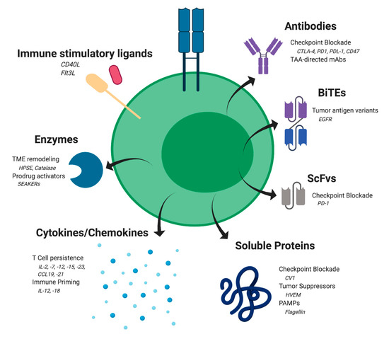 Loss-of-function mutations in tumor suppressor genes and their regulators can result in the onset and progression of cancers [132]. Continuous delivery of functional tumor suppressor protein to the tumor by cellular micropharmacies can overcome these mutations. For example, herpes virus entry mediator (HVEM) is frequently mutated in germinal center lymphomas, stimulating neoplastic B cell receptor signaling and B cell growth. CD19-targeted CAR T cells engineered to deliver soluble HVEM to lymphomas showed superior efficacy than CAR T cells alone due to soluble HVEM binding to the inhibitory receptor BTLA on B cells [133]. This creative approach highlights the potential role of TCMs as therapeutic agents that can directly deliver an unstable protein or peptide to the diseased tissue.
