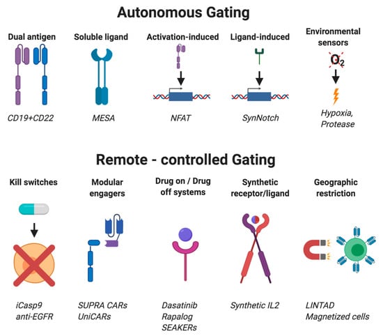 Current FDA-approved CAR T cells are designed to kill cells based solely on tumor antigen recognition, such as “if antigen, then activate to kill cell”. This simple autonomous logic gate can cause adverse events, such as “on target, off tumor” killing [192]. Gated autonomous systems attempt to address this limitation by introducing more sophisticated instruction sets for cells in order to kill.