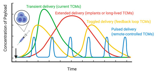 Gating strategies provide a sophisticated way to modulate the expression of therapeutic cargo delivered by TCMs. Current technologies include autonomous systems, which are programmed to automatically respond to an external stimulus, or remote-controlled systems, which allow toggled expression or localization of the cellular agent or cargo.