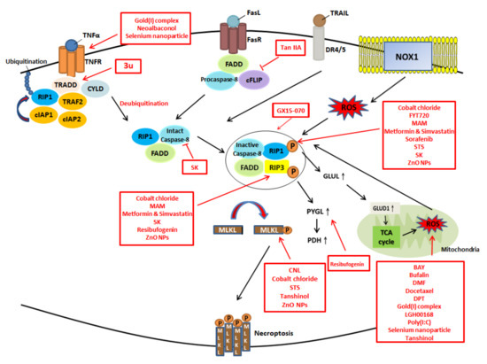 - Fulda, S. Repurposing anticancer drugs for targeting necroptosis. Cell Cycle 2018, 17, 829–832. [Google Scholar] [CrossRef] [PubMed]