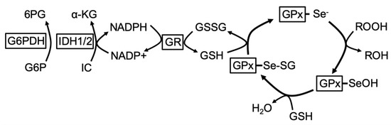 Schematic of the reduction of hydroperoxides by selenocysteine-containing glutathione peroxidases (GPx). The selenolate state (GPx-Se-) reduces hydroperoxides to water to form the oxidized selenenic acid (GPx-SeOH). GPx-SeOH reacts with GSH to generate selenenyl sulfide (GPx-SeSG), which is regenerated to the active selenol following nucleophilic attack of a second GSH and formation of oxidized glutathione (GSSG). GSSG is reduced back to GSH by glutathione reductase (GR). Nicotinamide adenine dinucleotide phosphate (NADPH) reducing equivalents for this reaction are mainly derived from isocitrate dehydrogenases (IDH)1/2, including the forward reaction of IDH2 in the tricarboxylic acid (TCA) cycle, and via the reduction of glucose-6-phosphate (G6P) in the pentose phosphate pathway by glucose-6-phosphate dehydrogenase (G6PDH). (Enzymes are indicated by boxes; α-KG: α-ketoglutarate; IC: isocitrate; 6PG: 6-phospho-gluconate).