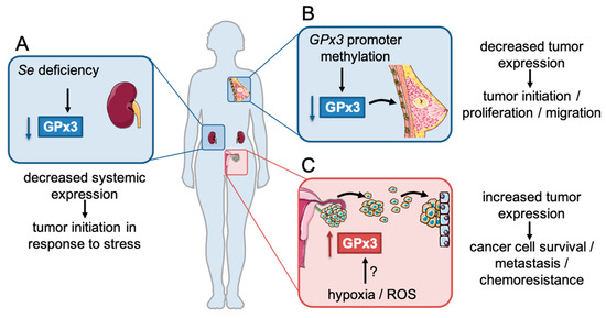 GPx3 has context-specific functions in cancer. (A) GPx3 expression can be altered at the systemic level in tumor patient plasma, likely as a consequence of Se deficiency. In animal models, decreased systemic GPx3 expression has been shown to be associated with tumor initiation in response to oxidative stress. (B,C) GPx3 expression is also altered within tumor tissues. (B) GPX3 promoter hypermethylation has been associated with decreased GPx3 expression in some tumor tissues, including breast cancer. Decreased GPx3 expression has been associated with tumor initiation, proliferation, and migration, as a consequence of increased oxidative stress and pro-tumorigenic redox signaling. (C) The dichotomous role of GPx3 is highlighted by observations that GPx3 expression is also increased in some tumor tissues, including ovarian cancer. Increased GPx3 expression is associated with stemness, increased cancer cell survival, chemoresistance and metastatic progression. While the mechanisms of increased GPx3 expression remain to be fully elucidated, it is possible that stress response pathways, including hypoxia and oxidative stress, may contribute to GPx3 expression in these tumors.