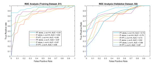 For D1, the best combination of IT and PT bpMRI features resulted in AUCs of 0.85 and 0.95 for the L-vs.-I + H and L-vs.-H classifications, respectively. Similarly, for D2, AUCs were 0.75 and 0.87 for the L-vs.-I + H and L-vs.-H settings, respectively.