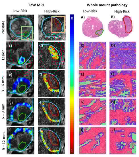 Peri-tumoral and intra-tumoral regions of interest (ROIs) overlaid with representative radiomic features on T2W MRI showing differential expression between low (a) and high (b) D’Amico risk prostate cancer patients, along with corresponding whole mount histopathology (A) and (B). Gabor feature map within the lesion (c) and (d) and representative pathology from corresponding region (C and D) with epithelium (purple), lumen (green) and stroma (pink) segmented. Similarly, Haralick (3–6 mm) (e) and (f), CoLlAGe (6–9 mm) (g) and (h) and Haralick (9–12 mm) (i) and (j) radiomic features within peri-tumoral annular rings within the prostate boundary (cyan). Representative peri-tumoral tissue compartments segmented on corresponding pathology are shown in (E–J). Quantitative feature values are provided in Supplementary Table S3.
