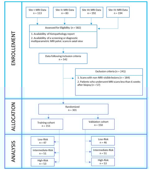 To this cohort, we applied the following exclusion criteria: (1) scans with non-MRI-visible lesions (identified using histopathology reports), (2) patients who underwent MRI scans less than 6 weeks after biopsy in order to avoid hemorrhage artifacts in images. The final cohort comprised n = 301 lesions from N = 231 patients (Figure 4).