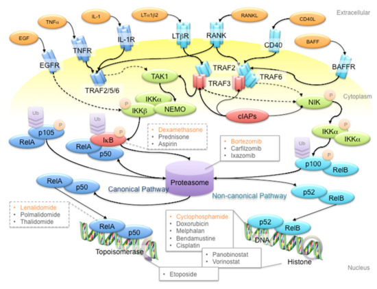 Schematic diagram of the NF-κB signaling pathway and anti-multiple myeloma (MM) drug targets. First-line anti-MM drugs (highlighted in orange) passively target the canonical and/or non-canonical pathways to shut down NF-κB signaling. For example, bortezomib inhibits the 26S proteasome to hinder the processing of p105 and p100 proteins, to prevent gene transcription activation in canonical and non-canonical NF-κB signaling pathways, respectively; dexamethasone induces IκB protein synthesis to inhibit p105 processing; lenalidomide reduces RelA binding to open chromatin; cyclophosphamide is a DNA alkylating agent that disrupts DNA replication and genome stability. Ligands, adaptor proteins and transcriptional complexes involved in canonical NF-κB signaling are depicted in dark blue, whereas those involved in non-canonical NF-κB signaling are depicted in light blue; kinases are depicted in green; inhibitors are depicted in red. P and Ub indicate the post-translational modifications of phosphorylation and ubiquitination, respectively. Arrows with triangle heads indicate activation, whereas arrows with rhomboid heads indicate inactivation/inhibition; direct interactions are indicated by solid lines, whereas indirect interactions are indicated by dash lines.