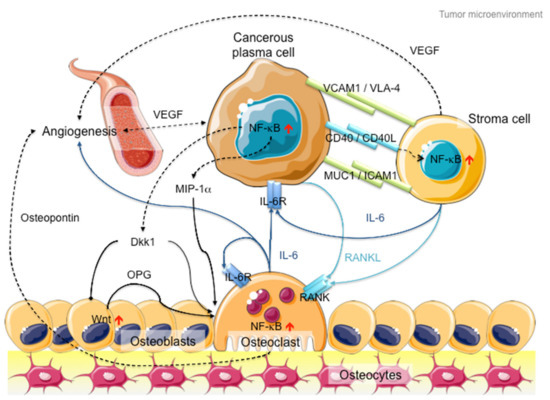 In addition to intracellular NF-κB hyperactivation, MM cells also manipulate NF-κB signaling in the bone marrow microenvironment to promote cancer growth and invasion (Figure 2). On the one hand, myeloma cells hijack stromal cells to secrete cytokines, such as interleukin-6 (IL-6), receptor activator of NF-κB ligand (RANKL) and vascular endothelial growth factor (VEGF), to promote cancer proliferation and angiogenesis [46]. On the other hand, myeloma cells secrete Dickkopf-1 (Dkk1) and macrophage inflammatory factor 1α (MIP-1α) to inhibit osteoblast differentiation to block new bone formation, and activate osteoclasts to promote osteolysis [47,48]. In late-stage MM patients, the myeloma cells acquire additional genetic abnormalities that lead to reduced dependency on the microenvironment (e.g., P53 mutation), increased drug resistance and increased aggressiveness of the clone (e.g., 1q21 amplification and CKS1B overexpression) [49]. Hence, therapies against both MM cells and microenvironment control, such as daratumab, an antibody drug against CD38 that induces antibody-dependent cytotoxic events in CD38-expressing cancer cells and complement-dependent cytotoxicity [50,51,52], show success in MM treatment [53].