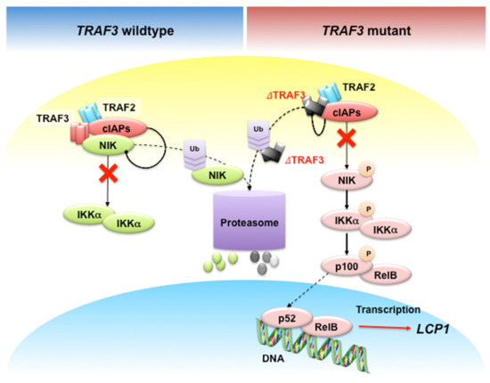 Recently, Shin, et al. identified lymphocyte cytosolic protein 1 (LCP1) gene as a novel NF-κB target in TRAF3 or NIK mutant MM cells [94] (Figure 5). TRAF3 loss induces constitutively active NIK [95,96], which frequently occurs in MM patients [8,14,17]. B cell-specific TRAF3-/- mice developed MM and peripheral B cell hyperplasia [97,98,99,100].