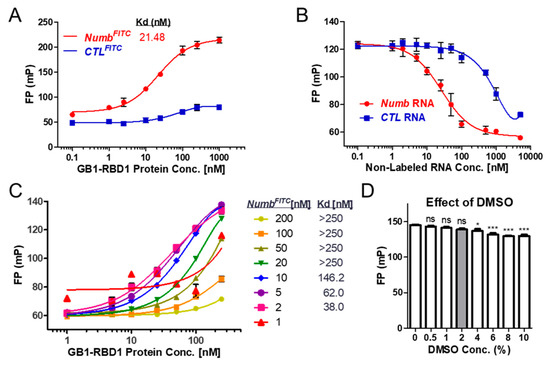 We used an FP assay to identify compounds that disrupt the interaction of MSI1 with a target RNA, Numb. In our initial binding assays, we used 2 nM of RNA as specified in previous publications [33,34]. We measured the binding of different concentrations of protein G B1 domain-tagged MSI1 RNA-binding Domain1 (GB1-RBD1) to Fluorescein isothiocyanate (FITC)-labeled Numb RNA (NumbFITC) or control RNA (CTLFITC). As shown in Figure 1A, NumbFITC but not CTLFITC bound to GB1-RBD1 as indicated by the increased polarization value. We further tested binding by competing the RBD1-NumbFITC complex with non-labeled Numb or control RNA. Numb RNA displaced the NumbFITC from the protein–RNA complex at a much lower Ki than the control RNA (Figure 1B). This established binding between Numb RNA and GB1-RBD1 formed the basis for the following screening assay.