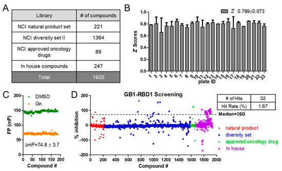 The chemical libraries used in the initial screening contained three chemical libraries from the National Cancer Institute (NCI) [26] and our own in-house compounds. NCI libraries consist of a (1) natural products set; (2) diversity set II; (3) approved oncology drugs set. Compounds from NCI are stored at −20 °C in 96-well plates at the concentration of 10 mM in DMSO. The in-house compounds are stored as 20 mM DMSO stocks and diluted to 0.5 mM to use in the one-dose initial screening. For the NCI chemicals, 0.1 μL of 10 mM stock was deposited into A2-H11 of each plate in duplicate, 0.1 μL DMSO was placed into A1-H1, and our positive control Gossypolone (10 mM) (0.1 μL) was placed into A12-H12. For our in-house compounds, we first diluted the chemical stocks to 0.5 mM, and then placed 2 μL of each chemical into each individual well. A total of 100 μL RBD1-NumbFITC complex was added to each well.