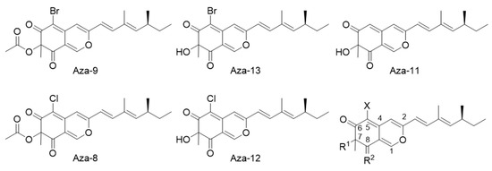 Although Aza-9 and the other azaphilones we have tested were produced semi-synthetically from asperbenzaldehyde, our semi-synthesis mimics a natural process. Aza-7 is identical to sclerotiorin, which is produced by a number of fungi [50,51,52], and has been reported to have anticancer activity [52]. Azaphilones are an interesting group of fungal natural products. More than 170 azaphilone compounds are produced by fungi, and they have a number of important biological activities. A substantial number of them have been reported to have anti-cancer activities [53].