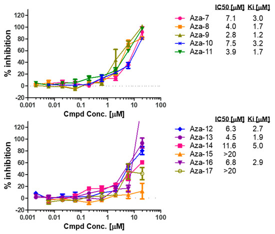 To further examine the initial hits, we tested compounds with similar scaffolds shown in Figure 3 and Figure S1 in an FP dose-response assay. As shown in Figure 4, all compounds except Aza-15 and Aza-17 showed a dose-response effect in disrupting the RBD1-NumbFITC complex; Aza-9 showed the highest affinity towards GB1-RBD1. We thus focused our further validation studies on Aza-9.