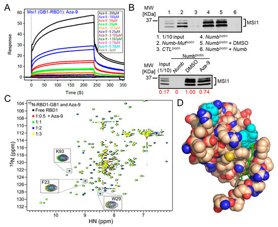 Validation of the top hit Aza-9. (A) SPR analyses of Aza-9 binding to immobilized GB1-RBD1. Sensorgram representing direct binding kinetics for Aza-9 are shown in response units (RUs) as a function of time with increasing concentrations (shown as colorful lines). (B) Numb RNA pulldown. (Top) Numbbiotin (lane 4) can pull down MSI1 but not CTLbiotin (lane 3); Numb-Mutbiotin (lane 2) partially pulled down MSI1. Adding of unlabeled Numb RNA (lane 6) abolished the binding completely, while DMSO did not have an effect (lane 5). n = 3, one representative western blot is shown. (Bottom) 20 μM Aza-9 attenuated the binding between MSI1 and Numbbiotin RNA. n = 2, one representative western blot is shown. (C) Overlay of 15N-HSQC (Heteronuclear single quantum coherence spectroscopy) spectra sections of MSI1-RBD1 (black), and MSI1-RBD1 bound to Aza-9 at different ratios. (D) Computational docking of Aza-9 bound to RBD1. The Aza-9 is shown in sticks, and the protein is represented as spheres. Three of MSI1-RBD1 RNA binding residues (W29, F23, and K93) that undergo significant peak shifts are highlighted in cyan.
