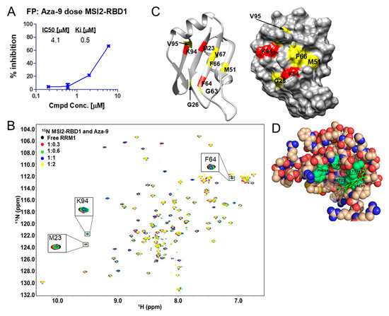 To investigate further the binding of Aza-9 to MSI1-RBD1 and to identify the residues of MSI1-RBD1 that are affected upon binding of Aza-9, we used protein nuclear magnetic resonance (NMR). As described in our previous publication [36], using NMR, we successfully identified the RNA binding residues of MSI1-RBD1—W29, K93, F23, and F65 [37]. Upon titration of Aza-9 with 15N-labeled MSI1-RBD1, residues 62, 64, 28, 94, 93, 22, 61, 23, 52, 95, 29, 40, and 68 experienced line broadening, indicating that these residues were affected by the binding of Aza-9 to MSI1-RBD1 (Figure 5C). When mapped onto the structure of MSI1-RBD1, many of the residues previously shown to bind to RNA are directly affected upon titration of Aza-9, along with the residues that are near the RNA-binding regions of MSI1-RBD1 (Figure 5C). Computational docking suggests a binding mode in which Aza-9 interacts with residues K93 and F23 in MSI1-RBD1 (Figure 5D). Binding of Aza-9 near K93 and F23 will compete with the aromatic packing of cognate RNA in the MSI1-RBD1. Our NMR results confirm that Aza-9 binds directly to MSI1-RBD1 and that this binding event occurs in the RNA binding pocket (Figure 5C). In parallel, computational docking provides a model consistent with these NMR observations and allows us to propose a specific binding mode for Aza-9.