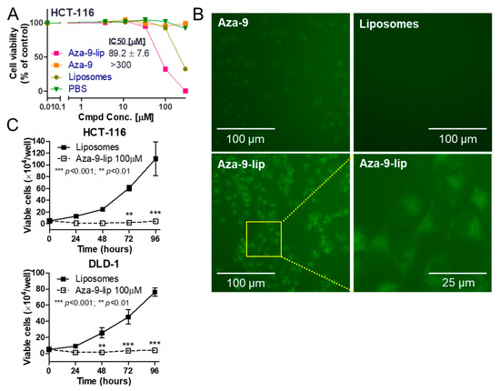 Aza-9-liposome (Aza-9-lip) inhibits colon cancer cell proliferation. (A) MTT-based cytotoxicity assay of Aza-9-lip, free Aza-9, liposomes, and PBS in colon cancer cell line HCT-116. Aza-9 had no effect on the cell viability due to poor cellular uptake. (n = 3, one representative experiment of three is shown.) (B) PEGylated liposomes facilitate Aza-9 entry into the cells. Aza-9 fluoresces in the green channel. Images of Aza-9-lip (100 µM), Aza-9 (100 µM), and liposomes were taken at 2 h after the treatment. (C) Aza-9-lip inhibits HCT-116 and DLD-1 cell growth. (n = 3, ** p < 0.01; *** p < 0.001 versus liposomes control. One representative experiment of three is shown.).