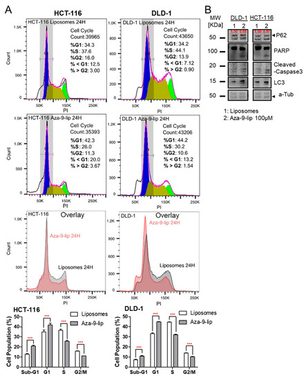 Aza-9-liposome (Aza-9-lip) induces apoptosis (or autophagy) and leads to cell cycle arrest. (A) Cell cycle analysis of 100 µM Aza-9-lip or liposomes treated DLD-1 or HCT-116 cells at 24 h. Aza-9-lip treatment led to an increased sub-G1 population, indication of apoptosis. Aza-9-lip treatment also induced a G1 block and led to cell cycle arrest. (Bar graph, n = 3, *** p < 0.001 versus liposomes control. Spectrums are from one representative treatment.) (B) Caspase-3/PARP cleavage, P62 degradation and LC3 conversion were observed in colon cancer cell lines treated with 100 µM Aza-9-lip for 24 h, cell lysate was subject to western blot for PARP cleavage, caspase-3 cleavage, and LC3 I/LC3II expression.