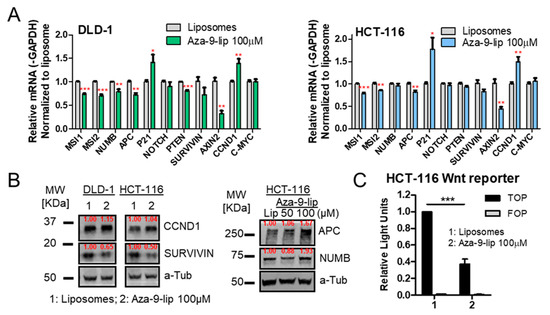 Aza-9-lip down-regulates Notch/Wnt signaling in colon cancer cell lines. (A,B) Notch/Wnt target genes expression changes upon Aza-9-lip treatment were examined in HCT-116 and DLD-1 cells by quantitative real-time PCR (A) and by western blot (B,C) Aza-9-lip inhibits Wnt/β-catenin reporter. HCT-116 cells were transfected with TOPflash or FOPflash reporter constructs. Cells were treated with Aza-9-lip or liposomes only for 24 h. All figures, n = 3; * p < 0.05; ** p < 0.01; *** p < 0.001 versus liposomes control.