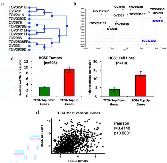 Gene expression analysis of our EOC cell lines, and comparison to tumor samples from the TCGA high-grade serous carcinoma (HGSC) dataset. (a,b) The complete normalized gene expression data for each of the 12 analyzed cell lines (10 from this work plus the two matched tumor cell lines from patients 2978 and 3291) was subjected to (a) unsupervised hierarchical clustering and (b) principal component analysis (PCA) using the TM4 MeV software. (c) Expression of the 1000 most up- or downregulated genes in HGSC tumors from the TCGA cohort (left) was verified in 10 of our HGSC cell lines (8 from this work plus the two matched TOV2978G and TOV3291G cell lines) (right) and plotted as bar graphs (mean ± SEM). (d) Expression of the 1000 most variably expressed genes in the TCGA HGSC cohort was verified in the 10 HGSC cell lines mentioned in (c), and Pearson correlation analysis was performed.