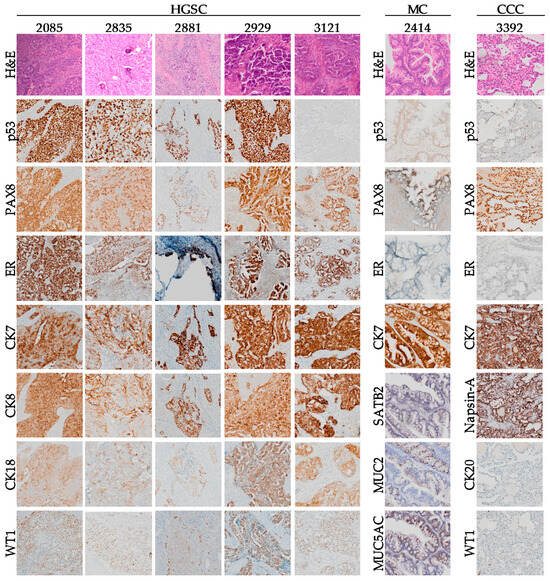 Due to the selection pressure inherent in establishing immortalized cell lines, it is important to verify that the cell line obtained reflects the EOC subtype of the original tumor. Therefore, we performed specific protein biomarker analyses of tumor tissue samples and cell lines by immunohistochemistry (IHC) and Western blot (WB), respectively. The tumor tissue of origin of the corresponding patient was subjected to a hematoxylin and eosin (H&E) staining, followed by IHC stains for various described epithelial ovarian cancer biomarkers [55] (Figure 3 and Figures S2 and S3). The representative epithelial malignant region characteristic of each EOC subtype [56,57] was selected based on morphology by H&E stain by a gynaecologic-oncology pathologist (KR), and the same region was used for each biomarker tested by IHC.