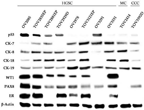 Protein expression of EOC subtype-specific markers in tumor cell lines. Detection of characteristic subtype-specific EOC markers (p53; cytokeratins 7, 8, 18, and 19; WT1; PAX8; and ER) of whole cell lysates of each cell line. β-Actin was used as control (n = 3).