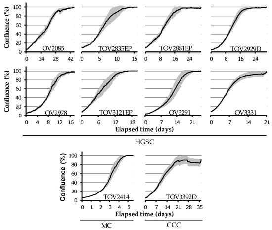 Average doubling time varied greatly from one cell line to the next, ranging from 1.3 to 6.2 days (Table 4). Of note, the two non-HGSC cell lines TOV2414 and TOV3392D showed significantly lower doubling time than the rest of the cell lines tested (Student’s t-test, p = 0.0013) but were not significantly different when compared to each other (Student’s t-test, p = 0.12). The confluence-based proliferation curves show that TOV2414 was the fastest-growing cell line, whereas OV2085 was the slowest (Figure 5 and Figure S7). For the majority of cell lines, the confluence-based proliferation curves showed similar results to doubling time (i.e., high proliferation rate, low doubling time value), except for OV2085 and TOV3392D, whose confluence curves indicate a slower growth than their doubling time values when compared to other cell lines (Figure 5 and Figure S7, Table 4). This discrepancy can be explained by the unique growth phenotype of these two cell lines, which causes dissociation between changes in confluence and cell number. TOV3392D has a low doubling time (2.1 days) but grows very compactly and thus takes longer to achieve confluence (26.0 days) despite the increase in cell number. OV2085, on the other hand, grows upward rather than along the bottom of the culture dish, thus proliferating without accurately reflecting this change on confluence (Figure 5 and Figure S7, Table 4). Saturation density ranged from 1.3 × 106 cells for the OV3291 cell line, whose cells are morphologically large, to 15.2–17.8 × 106 cells for the OV2085 and TOV3392D cell line, which have a very small and compact morphology at saturation (Table 4).