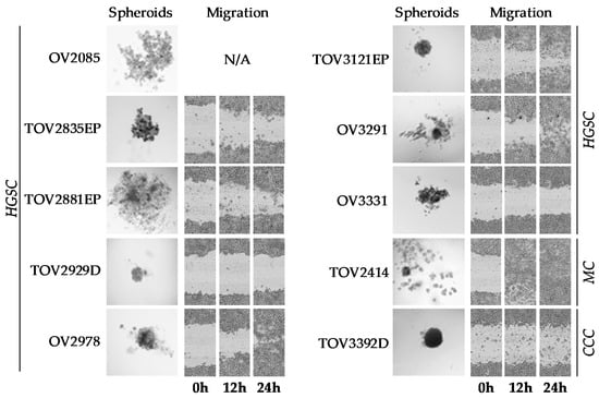 The migration potential of each cell line was evaluated by wound-healing migration assay using live cell imaging (Figure 6). Migration velocity was calculated based on wound surface closure as a function of time, as described in Methods (Table 4). TOV2414 showed the highest migration velocity (103.0 µm/h), closing the wound entirely in less than 12 h (Student’s t-test, p = 2.79 × 10−12), whereas TOV3392D and TOV2929D had the slowest migration velocity (0.9 µm/h and 3.8 µm/h, respectively), showing little to no ability to migrate (Student’s t-test, p = 1.64 × 10−30). OV3331 migrated visibly with low velocity (9.7 µm/h), whereas TOV2835EP, TOV2881EP, OV2978, TOV3121EP, and OV3291 demonstrated similar intermediate wound-healing efficacy (32.4–42.9 µm/h) (Table 4). The migration potential of OV2085 could not be determined by this assay, as this cell line could not be seeded at confluence prior to scratching, precluding the generation of a clean wound.
