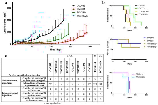 To evaluate growth potential in vivo, each cell line was injected subcutaneously (SC) or intraperitoneally (IP) in NOD rag gamma (NRG) mice (n = 5 mice per injection site for each cell line) (Figure 7 and Figure S8). Four of the cell lines, OV2085, OV3331, TOV2414, and TOV3392D, produced tumors in mice upon SC injection. TOV3392D produced the most rapidly growing tumors of the four cell lines, reaching 500 mm3 after an average of 35 days post-SC injection, but this cell line also induced severe cachexia in all mice injected SC (n = 10 mice over 2 experiments), forcing ethical interruption of the experiment and sacrifice of the mice between 53 and 68 days post-injection. Of the other tumor-forming cell lines, OV2085 grew the fastest, followed by TOV2414 and OV3331, which reached a tumor volume of 500 mm3 after an average 65, 125, and 170 days, respectively (Figure 7). None of the other cell lines could form tumors in this mouse model (Table S2, Figure S8).