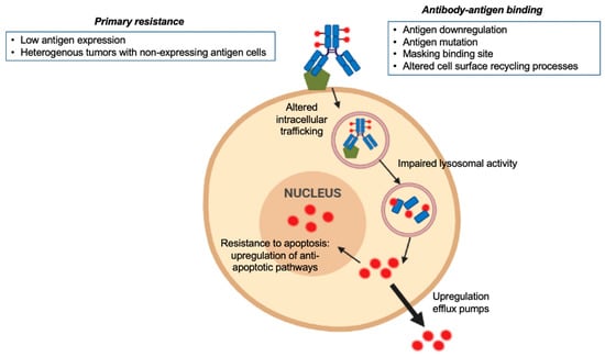 Mechanisms of primary and acquired resistance to ADCs are complex and depend on the components of the drug (Figure 1). Antibody-antigen binding, the payload type, and the chemical structure and stability of the linker are crucial steps for resistance to ADCs [57]. Heterogeneous tumors with a high proportion of antigen non-expressing tumor cells, or low expression of the targeted antigen, can diminish ADC efficacy and contribute to primary resistance to the drug. In addition, although it is not considered a resistance mechanism per se, premature payload deconjugation before reaching the tumor (i.e., cleavable linkers with unstable chemical structure) can decrease the final amount of ADC reaching the targeted tumor cells. The antibody-antigen binding process and the regulation of the surface antigen itself are key factors to induce acquired resistance [58]. Mutations in the expressed antigen, alterations in the cell surface recycling process along with downregulation of the antigen itself can alter antibody-antigen binding [59,60]. Other variations concerning the internalization process of the complex antibody-antigen or in the intracellular trafficking mechanism together with impaired lysosomal activity have also been described as possible mechanisms of acquired resistance [61,62,63]. Commonly shared with other cytotoxic agents, once the payload has been released into the target cell, efflux pumps can contribute to expelling the drug outside the cell. The upregulation of these pumps and systems is one of the main mechanisms of resistance described associated with cytotoxic agents and also described with ADCs [58,64].