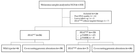 From 2014 to 2019, 113 patients with a cutaneous melanoma underwent NGS analysis at the University Hospital of Montpellier. All primary samples were obtained prior to any treatment initiation, as well as most of the metastasis samples, with the exception of five recurrent metastatic BRAFV600 melanomas that have been previously treated by targeted therapy. The noninterventional study was conducted in accordance with local ethical guidelines and was reviewed by the Ethical Committee from the Montpellier University Hospital (March 2019). Samples were obtained following research project approval by the Institutional Review Board from CRB-CHUM (BB-0033-00031). An approved informed consent statement was acquired for all patients. All corresponding lesions were excised and submitted for standard pathological examination. The percentage of tumor cells in the series ranged from 30 to 100% (Table S2). Tissue punches using a 1 mm needle or macrodissected 10 μm thick section were performed from tumor paraffin blocks to increase the percentage of tumor cells in the sample. Genomic DNA was extracted using the Maxwell® RSC DNA FFPE Kit (Promega, Madison, WI, USA) according to the manufacturer’s recommendations. Twenty-four patients were excluded from the study owing to lost-to-follow-up, absence of targeted therapy for BRAFV600 patients, and/or poor quality of extracted DNA (Figure 1). Medical records were reviewed to extract clinicopathological data, including sex, age, diagnoses, therapeutic agents, and survival.