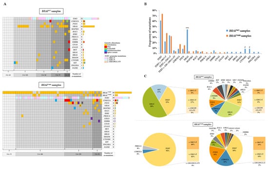 Mutational landscape profiling in BRAFWT and BRAFV600 samples. (A) Co-occurring genetic alterations detected in BRAFWT (n = 36, upper panel) and BRAFV600 samples (n = 53, lower panel). Alteration types are specified (substitution, stop, frameshift, deletion/insertion, or splice variant), except for TERT c.-146C>T, c.-124C>T, or c.-138/139CC>TT mutations. The total number of mutations is shown for each mutated gene in the histogram at the right side of the figure. (B) Frequency of mutated genes in BRAFWT and BRAFV600 samples. *** p < 0.001; # p-values close to significance (p = 0.06). (C) Percentage of mutated genes in BRAFWT (upper panel) and BRAFV600 (lower panel) samples according to the number of co-occurring genetic alterations. Left pie charts show the percentage of mutated genes in samples harboring a single genetic alteration in BRAFWT (n = 12) and BRAFV600 (n = 26). Right pie charts show the percentage of mutated genes in samples harboring several genetic alterations in BRAFWT (n = 18) and BRAFV600 (n = 20).