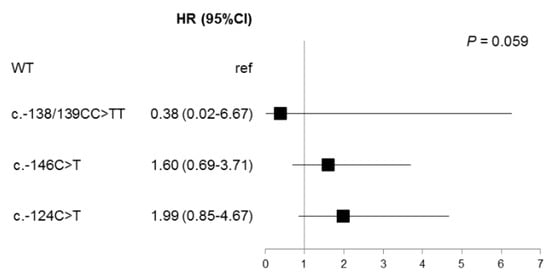 However, when TERT mutations were considered separately, a trend was observed (p = 0.059) with a longer PFS for patients harboring a c.-124C>T mutation (Figure 3). When these parameters were entered in a multivariate Cox model, the prognostic significance of the LDH level, brain metastasis, and TERT c.-124C>T mutational status remained in the model (Table 3), demonstrating that these biomarkers are independent prognostic markers of PFS.