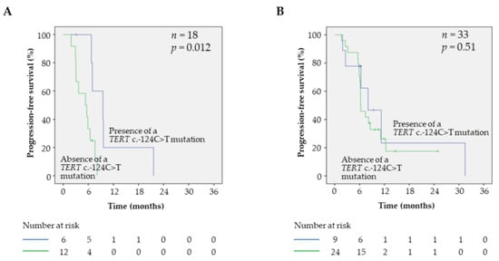 Effect of TERT c.-124C>T mutation on clinical outcome of BRAFV600 patients with or without brain metastasis. (A) Kaplan–Meier analyses of PFS in patients with brain metastasis in function of the TERT c.-124C>T mutation status. (B) Kaplan–Meier analyses of PFS in patients without brain metastasis in function of the TERT c.-124C>T mutation status.