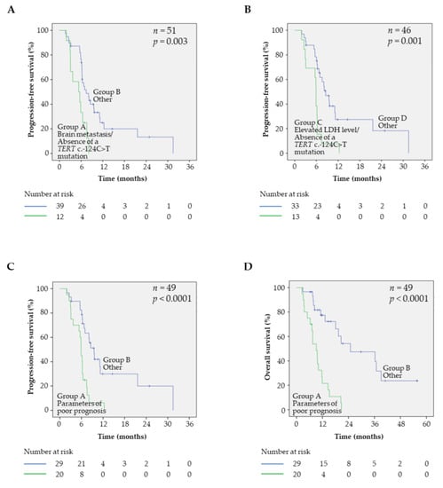 Prognostic value of a signature combining parameters of poor prognosis: elevated LDH level, brain metastasis, and absence of TERT c.-124C>T promoter mutation. (A) Kaplan–Meier analyses of PFS in patients combining brain metastasis and absence of TERT c.-124C>T promoter mutation (group A, green curve) and in the remaining patients (group B, blue curve). (B) Kaplan–Meier analyses of PFS in patients combining elevated LDH level and absence of the TERT c.-124C>T promoter mutation (group A, green curve) and in the remaining patients (group B, blue curve). (C) Kaplan–Meier analyses of PFS in patients combining parameters of poor prognosis (group A, green curve) and in the remaining patients (group B, blue curve). (D) Kaplan–Meier analyses of overall survival (OS) in patients combining parameters of poor prognosis (group A, green curve) and in the remaining patients (group B, blue curve).