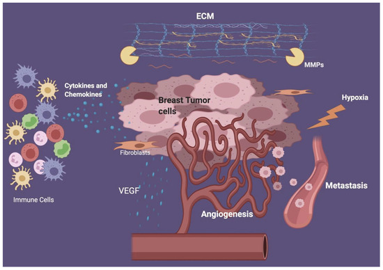 Apart from tumor cells present in breast cancer, the tumor microenvironment (TME) contains other cells such as fibroblasts and immune cells, extracellular matrix (ECM), blood vessels, and some signaling molecules [19]. TME is important for tumor angiogenesis, immune cells’ inhibition, escape from immune surveillance, as well as tumor proliferation and survival [7]. ECM plays a major role in breast cancer microenvironment, as it provides the physical support to solid tumors by its protein components such as collagen and proteoglycan. Additionally, ECM is rich in several growth factors that can regulate angiogenesis and inflammation [20]. In advanced stages, ECM becomes disrupted and dysregulated allowing tumor growth by metalloproteinases (MMPs), aiding in cells migration from or into the TME, and thus assisting tumor metastasis [21,22].