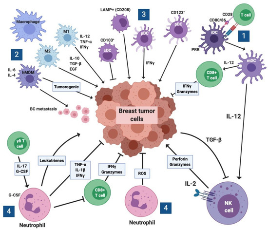 Interplay among various cell types and inflammatory molecules in breast cancer microenvironment. The cells can be divided into subcategories. (1) Role of killer cells. Upon the cognate interaction among T cells and immature dendritic cells (iDCs), the latter which also express pattern recognition receptors (PRRs) differentiate into mature dendritic cells (mDCs). These cells secrete IL-12 which activates cytotoxic T cells to release granzyme B and IFN-γ, which kill breast cancer cells. IL-12 also activates NK cells which release perforin and granzyme B to lyse tumor cells. Reciprocally, breast cancer cells utilize TGF-β to inhibit the function of killer cells. (2) Role of macrophages. Human monocyte-derived macrophages (hMDM) facilitate tumorigenesis by releasing cytokines. Similarly, M2 macrophages potentiate breast cancer cells growth through the release of suppressive molecules such as IL-10, TGF-β, and VEGF, which suppress the cytolytic activity of anti-tumor effector cells. In contrast, macrophages type 1 (M1) suppress tumor growth through the release of inflammatory IL-12, TNF-α and IFN-γ. (3) Role of dendritic cells. CD208 or LAMP+ DCs as well as plasmacytoid dendritic cells (pDCs) enhance tumor growth, whereas conventional dendritic cells (cDCs) inhibit their growth. (4) Role of neutrophils. Neutrophils may exert opposing effects on breast cancer cells growth. On the one hand, it may secrete reactive oxygen species (ROS) that may affect the growth of breast cancer cells. However, neutrophils by receiving IL-17 and G-CSF from γδ T cells may secrete leukotrienes, which inhibit tumor growth, or secrete the inflammatory cytokines TNF-α, IL-1β, or IFN-γ that could suppress tumor growth. Finally, neutrophils also inhibit the cytolytic activity of CD8+ T cells.