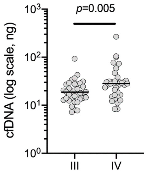 At least 4 mL of plasma was available for 72/74 (97%) patients, and the total recovered quantity of cfDNA ranged from 7.2–266.8 ng (median 22.75 ng). cfDNA quantity was significantly higher in patients with stage IV than stage III disease; median cfDNA was 28.75 ng versus 18.45 ng, respectively (Figure 1). Using a cfDNA threshold for NGS of 20 ng in 16.5 µL (i.e., 1.21 ng/ µL as recommended in the Ion Ampliseq HD library kit user guide), 9/36 (25%) stage III and 19/38 (50%) stage IV patients met this cfDNA threshold (Table 1).