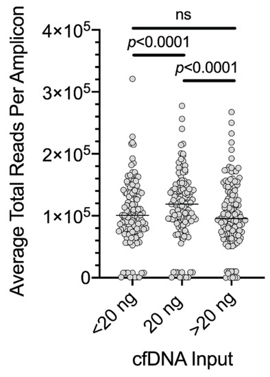Average total reads obtained for each amplicon in the custom melanoma panel. The input template cfDNA was <20 ng (n = 40 samples, range of 3.6–19.1 ng), 20 ng (n = 21 samples, range of 19.5–20.5 ng) or >20 ng (n = 8 samples, range of 21–42 ng). In each case, seven NGS sample libraries were run on an Ion 550 sequencing chip using the Ion Ampliseq HD workflow. Reading depth data for each amplicon for each patient are shown in Table S2. One-way ANOVA with Tukey’s multiple comparison test was performed. ns, not significant.