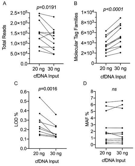 Relationship between sequencing performance, variant detection and cfDNA template input. (A–D) Pairwise comparison of mutations detected in matched patient samples (refer to Table S3) using either 20 or 30 ng cfDNA template input: (A) total reads; (B) molecular tag families (defined in materials and methods) per individual amplicon; (C) limit of detection (LOD); and (D) mutant allele frequency (MAF). Parametric paired t-tests were performed. ns, not significant.