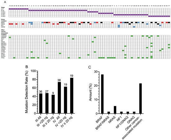 Summary of the melanoma mutation profile and rate of detection based on the custom melanoma panel. (A) Comparison of melanoma stage (purple boxes), driver mutation detected by tissue biopsy (red boxes), driver mutation detected by liquid biopsy (blue boxes), driver mutation detected by both liquid and tissue biopsy (black boxes) and other cancer-associated mutations (green boxes) identified across the cohort of 74 melanoma patients. Numbers represent patient sample number. IT, in-transit; LN, lymph node. For details on specific gene mutations and complete NGS data, refer to Tables S5 and S6. (B) Comparison of mutation detection rate for melanoma mutations based on the level of cfDNA used for NGS. Total sample number is shown above each histogram. For details on stage, cfDNA input and melanoma driver or other cancer-associated mutation detected, refer to Table S5. (C) Distribution of melanoma driver mutation (BRAF, GNAQ, NF1 and NRAS) or other cancer-associated mutation (only including those which lacked a BRAF, GNAQ, NF1 or NRAS driver mutation). Amount indicates percent of total melanoma cohort (n = 74).