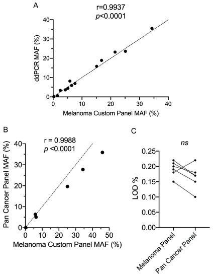 Validation of the custom melanoma panel. (A) Correlation of mutant allele frequency (MAF) determined by the melanoma custom panel versus ddPCR analysis. (B,C) Comparison of custom melanoma and Oncomine pan cancer targeted NGS panels. (B) Correlation of MAF based on mutations detected by both panels. (C) Pairwise comparisons of limit of detection (LOD) for matched mutations detected using both assays. For patient samples tested along with NGS and ddPCR data refer to Tables S8 and S9. Pearson correlation coefficient analysis and parametric paired t-test were performed.