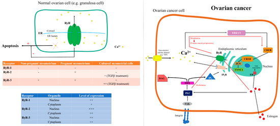 RyR-mediated Ca2+ signaling in ovarian physiology and cancer. RyR1 expression was not evidenced in either non-pregnant and pregnant myometrium nor in cultured myometrial cells. Meanwhile, RyR2 are expressed only in pregnant myometrium, and RyR3 are expressed both in non-pregnant and pregnant myometrium. Cultured myometrial cells express only RyR3, and TGF-β treatment upregulates both RyR2 and RyR3. Distinct subcellular expression of RyR subtypes was evidenced [81]. Persistent depletion of the ER Ca2+ deposits promotes apoptosis (+), while RyR inhibits (−) apoptotic cell death [122]. In ovarian cancer, RyR may contribute to the reduction of cancer progression by modulating the FAK//CREB/TNNC1 signaling pathway [127] and may modulate the ERα–PLCγ–IP3R pathway [128] (red line).