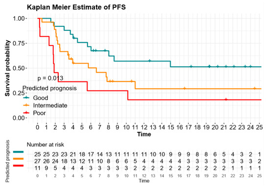 A clinical benefit was observed in 65% of patients according to DCR, and 58% of patients according to ORR (2 with CR, 35 with PR, and 4 with SD). In the logistic regression and according to the DCR classification, low TMTV (≤75 cm3) and low dNLR (≤3) were statistically associated with a clinical benefit (odds ratio (OR) 3.8, 95%CI 1.2–11.6 and OR 4.9, 95%CI 1.5–16.3, respectively; Table 4). In the logistic regression and according to the ORR classification, low LDH (≤ULN) and low dNLR (≤3) were statistically associated with a clinical benefit (odds ratio (OR) 5.8, 95%CI 1.4–24.7 and OR 3.3, 95%CI 1.1–10.5, respectively; Table 4). Notwithstanding the consequent odds ratio and indicative confidence interval, TMTV failed to reach the statistically significant threshold, namely: TMTV ≤ 75 cm3 with an OR of 2.5 (0.9–7.0) and p = 0.09.