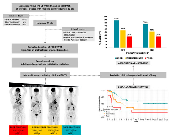Beyond the PD-L1 expression, easily measurable and accessible biomarkers for the prediction of outcomes are needed. Initial investigations, including a complete blood count and a 18F-Fluorodeoxyglucose positron emission tomography (FDG-PET), provide both diagnostic and staging information [9,10,11], but could also be predictive or prognostic [12,13,14,15,16,17,18]. On the basis of these two tests, certain parameters are beneficial and meaningful, particularly the derived neutrophils to lymphocytes ratio (dNLR) and the total metabolic tumor volume (TMTV) on FDG-PET [19].