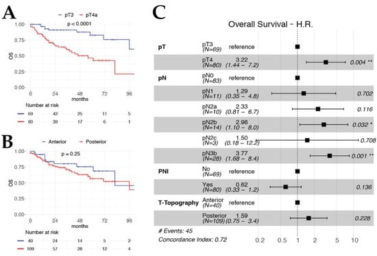 Kaplan–Meier curves for OS according to pT category (A) and T-topography (B). (C) Forest plot of OS multivariable model.