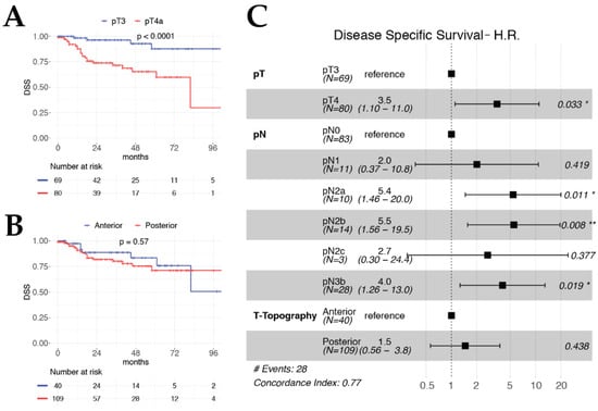 Kaplan–Meier curves for DSS according to pT category (A) and T-topography (B). Forest plot of DSS multivariable model (C).