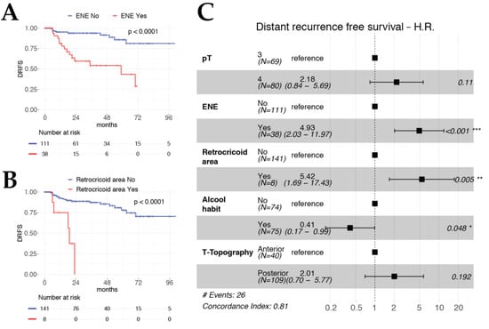 Kaplan–Meier curves for DRFS according to ENE status (A) and retro-cricoid area involvement (B). Forest plot of DRFS multivariable model (C).